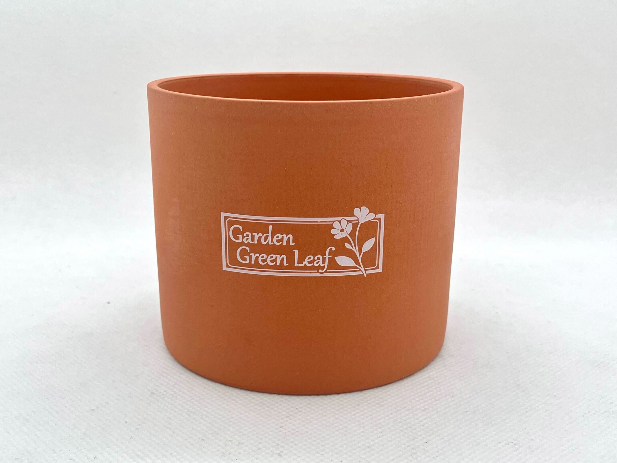 シリンダー型のテラコッタ植木鉢には、側面にロゴを印刷しています。